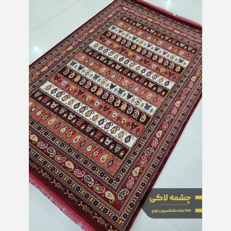 فرش لاکی بلوچی ماشینی کاشان700شانه آکرلیک طرح چشمه لاکی6متری(